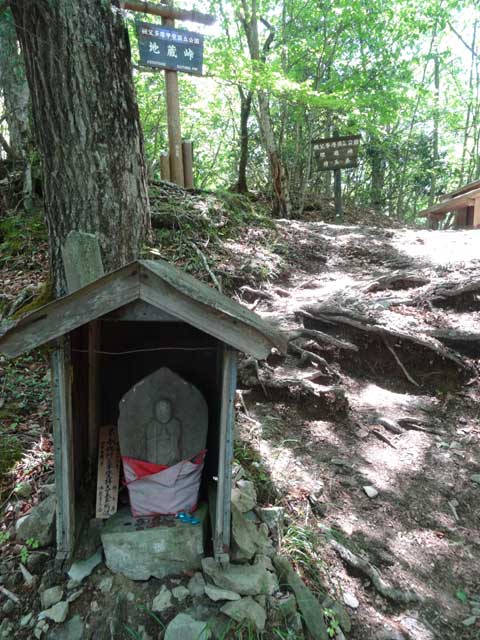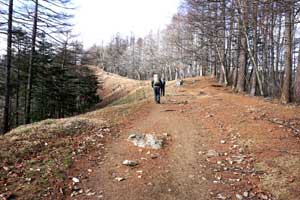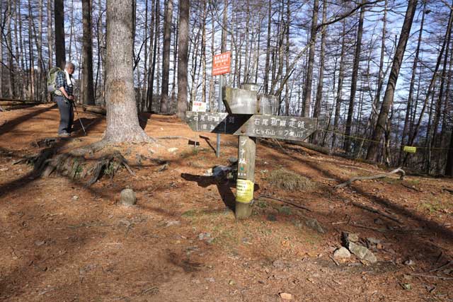 林道を進むと左に登山口があり、長い尾根の登りが始まる。山腹に付けられた登山道をひたすら登る。小袖山(1,050.1m)を巻くと水場がある。谷を挟んで赤指尾根と石尾根の稜線が見える。堂所は昔、バクチが行われていた場所だったといわれる。少し先に広い場所があるので腰を下ろせる。周囲はアセビと落葉樹の森だ。