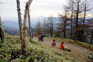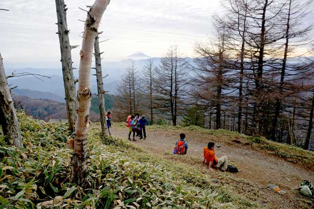 周囲にはカラマツ林と、マルバダケブキが目立ち、西側が開けて明るい。視界が大きく広がり眺望がよい。左前方には、三条ダルミから三ッ山、飛龍山へ続く奥秩父の山並み、西方に大菩薩連嶺と、その奥に南アルプスのパノラマが眺望できる。