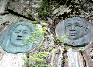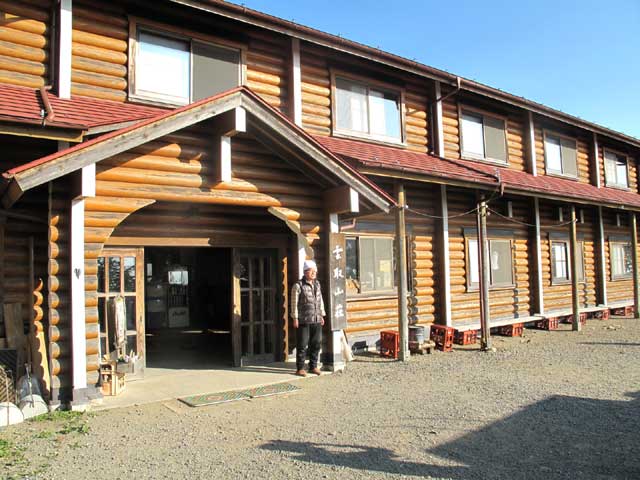 山頂からは北に向かって苔むした原生林の急坂になり、今まで登ってきた開放的な道とは一変する。山荘の手前には小屋の創設者富田治三郎と奥秩父開拓者の田部重治のレリーフがある。階段を下ると山荘の前に立つ。