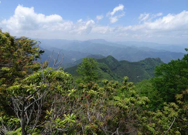 白岩小屋から前白岩山へ。奥秩父の山々がよく見える。少しずつ標高を落としながら、肩を過ぎると急坂の下りが連続する。鎖、ロープや木の階段、岩場も現れて緊張するところだ。