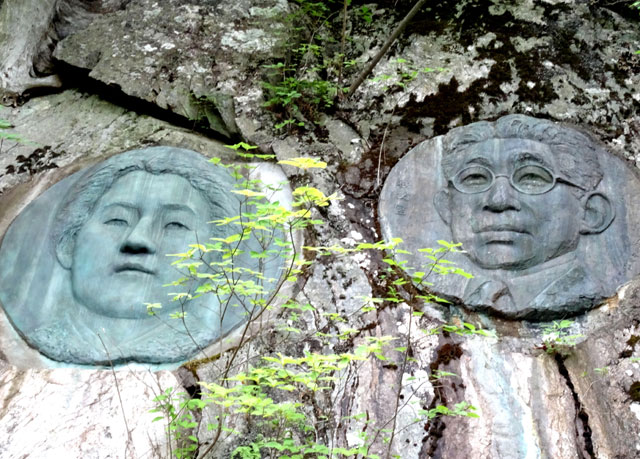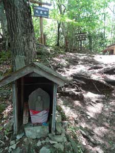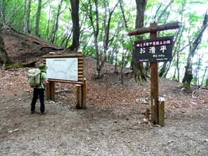 お清平からは登り返しとなり、緩やかになった最後の山道が続き、いきなり霧藻ヶ峰の休憩舎の前に出る。名前の由来となるサルオガセはなくなった。春はチチブドウダンが美しい。狭い場所ながらベンチやテーブルもあり、小屋の背後にはトイレもあって休んでいくのにはよい場所だ。階段を降りると、秩父宮殿下と妃殿下のレリーフが岩壁に埋め込まれている。その先にアセビに囲まれた三等三角点がある。ここから三峰口へは本格的な長い下りとなる。地蔵峠の小さな地蔵と標識を見て、北西へ延びる長い尾根をひたすら歩く。二岐檜、炭焼平、妙法ヶ岳分岐の鳥居などを通過して樹林の中を下る。三峯神社までの距離があとわずかになると、大きな鳥居がある登山口に出る。林道に出ると10分余りでビジターセンターに到着。大駐車場のすぐ前が三峯神社のバス停だ。