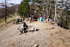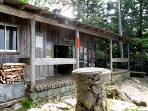 ここから白岩小屋に向かっては急下降だ。ジグザグ坂を下ると現在は使用されていない小屋の前に出る。ベンチと簡易トイレがあるので休憩できる。小屋の裏側からは、天気がよいと奥秩父の和名倉山と両神山が望める。