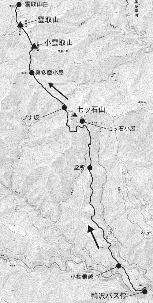 五十人平のヘリポートまで来ると奥多摩小屋はすぐそこだ。水場やトイレがあり、シーズン中は数多くのテントが張られて賑わう。あとは小雲取山に向かうひと登りが待っている。正面の急坂を登ると展望のよいヨモギの頭(1,813m)に立つが、右下の笹の中にある巻道を行ってもよい。小雲取山へは最後のきつい登りである。ジグザグに登る道は、だいぶ疲れも出てくる頃なので、ゆっくりと登りたい。