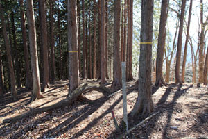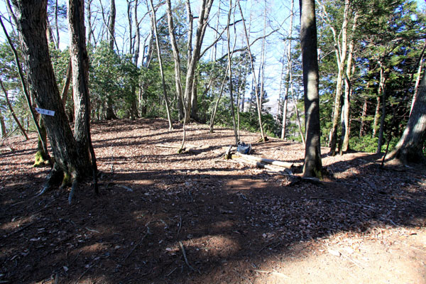 目標地点に着いたら、右の樹林の中に入る。地図と地形を見極めて、はっきりしない尾根筋を外さないように進めば、明瞭な尾根上の踏み跡となる。岩場を越え、冬でも煩わしいヤブを抜けて行くと、ふと小広い平坦地に飛び出す。正面の樹林の中を探ると、山名板の架かった木の根方に三等三角点が見つかる。平坦な山頂は、祭礼でも開かれていたかような雰囲気が漂う。イソツネという山名の由来も分からないが、沖ノ指の「沖」、イソツネの「イソ=磯?」を考えると、それぞれの山の間に何やら関係があるような気がしてならない。そうした意味からも、このふたつの山は興味深い。