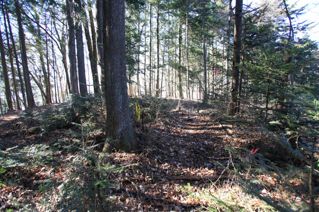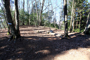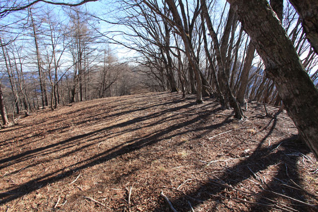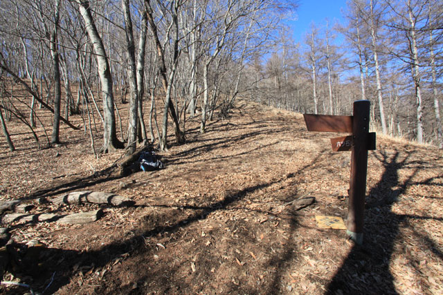 ここから再び植林の中の登りとなり、小さな社を過ぎるあたりから本格的な急登となる。岩も出てきて大きな段差の登りが続く。そんな登りも道標を過ぎた1,200m付近から緩くなり、自然林の中をトラバースしてトオノクボに到着する。トオノクボは開放的な明るさに満ちていて気持ちのよいところだ。