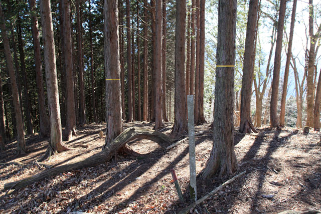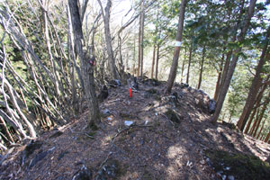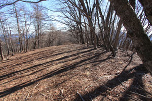 ルートは右手の植林帯と疎林の境目を下る。滑りやすい斜面に踏み跡はほとんどないが、70mほど下れば平坦になって明瞭な踏み跡が出てくる。踏み跡は右手の高みを左に巻いているが、この高みが沖ノ指(おきのさす/1,041m)だ。適当に岩場を越えて行くと山頂に着く。周囲はコナラ、ミズナラなどの広葉樹。荒れた雰囲気の山頂には赤い杭が打たれている。