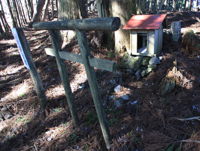 イソツネ山へは往路を戻ってもいいが、そのまま山頂を東へ進む。足元には充分注意したい。右手の樹間に奥多摩湖を見ながら数分も下れば、沖ノ指を巻いている踏み跡に出る。道といってもいいような踏み跡をたどれば山ノ神に着く。どんな由緒があるのか分からないが、奥多摩には、こんなところに、という場所に社や祠が見られ、人と山との深い関わりを想起させる。