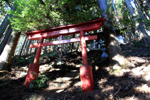 植林帯に入ると真っ赤な鳥居の産土(うぶすな)神社が現れる。主神は、山の安全、土地の平安を司る大山祇命(おおやまづみのみこと)とのこと。登山安全を祈願しておこう。神社からやや急な登りが始まる。左手の樹間には榧ノ木山から倉戸山の稜線が見え、右が植林、左がコナラやミズナラの自然林の中をひたすら登る。周囲が明るくなってひと登りすれば989m地点に到着する。産土神社から標高差で約300m。明るく開けた平坦な場所は休憩にぴったりだ。