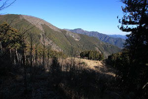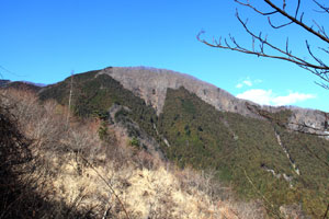 山の神からわずかに下ると、一気に展望が開ける。このコースのハイライトだ。左にどっしり構えるのは三ノ木戸山。そこからなだらかなスカイラインを描く石尾根の末端。その向こうに本仁田山。大休場尾根、花折戸尾根、ゴンザス尾根が落ちている。高水三山方面なども見渡せる。眼下の伐採跡は、冬季はカヤ、夏季は一面の灌木帯となる。しばし景観を楽しんだら、この伐採跡を通り抜けるがルートファインディングに気を付けよう。目標とするのは伐採跡にぽつんと残された樹林帯の右。獣道が縦横に走り、方向を惑わされやすいので慎重に目標を定めながら進もう。その年や時期によってカヤの生育は異なる。カヤは、ススキ、スゲなどの総称。カヤトはその群生地をいう。