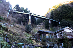 往路を戻る。岩場は右から回り込むこともできる。カヤトに戻ったら、右手の樹林に沿うように進む。ここも獣道が縦横に走るので注意しよう。ネットのフェンスが出てきたらそれに従って下る。このカヤトには2軒の人家があるが、上の1軒は廃屋だ。途中、モノレールを見るが、今は使われていないそうだ。