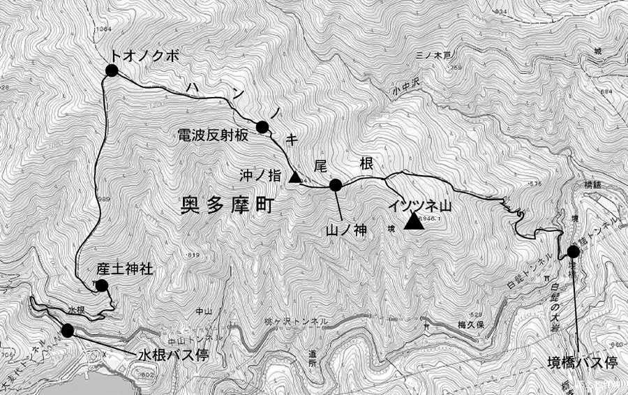 イソツネ山の名前を知っている人は少ないだろう。奥多摩をかなり歩き回っている人でないと、興味を持つこともないかもしれない。アプローチもバリエーションルートとなるし、ルートファインディングが求められる部分もある。一般コースのつもりで気軽に行ける山ではない。山歩きの経験の長い人、地形と地図が読める人、コンパスが使える人にお勧めの山だ。GPSがあれば、さらに安心感は高まる。北面に広がる伐採地は、夏季は背丈を超える灌木、冬季は一面のカヤトとなって視界が遮られる。そのうえトゲのある灌木が混在するので注意が必要だ。適期としては、12月から2月あたりだろう。
