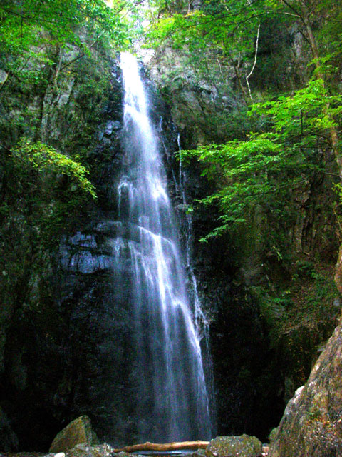 登山道に入ると小滝がいくつも現れ、木橋で何度か川乗谷を渡る。小一時間で川苔山と百尋の滝の分岐だ。設置されている階段を下りて行くと百尋の滝が眼前にどーんと現れる。一尋は両手を広げた長さ、約1.5~1.8mなので、百尋は150m以上ということになるが、実際の落差は30mほど。しかし、しぶきを浴びながら滝壺から見上げれば、百尋というのも納得できるだろう。