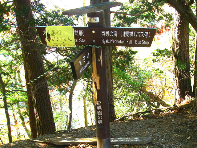 たっぷり百尋の滝を楽しんだら、いよいよ川苔山を目指して出発だ。来た階段を上り返し、先ほどの分岐もいつの間にか過ぎ、ぐんぐん高度を上げて行く。尾根を大きく左へ回り込み終わったあたりで左へ上がると百尋ノ滝山(962m)がある。道がいったん下りになり小さな沢を渡ると、間もなく足毛岩分岐だ。登山道は二手に分かれる。道標には、左へ上って行く道は山頂まで1.5km、右へ下って行く道は山頂まで1.8kmとある。変化に富んだ、右の足毛岩の肩経由のコースをとる。