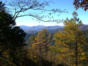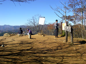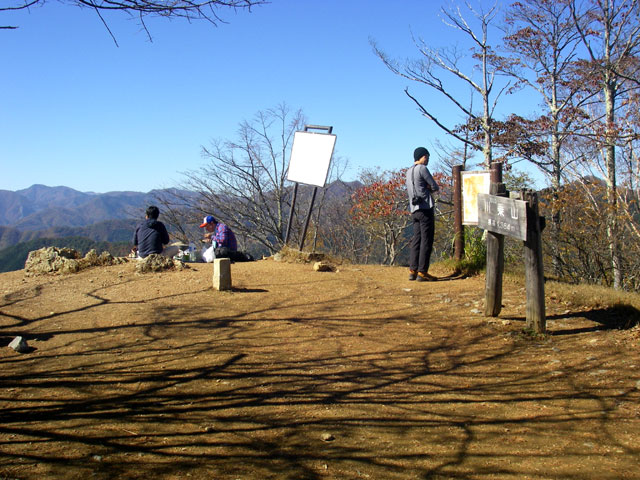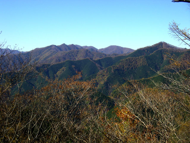 ここから山頂までがこのコースのハイライトだ。広い尾根道の左右の樹々の間から奥多摩の山々を眺めることができる。特に北方向には天目山(三ツドッケ)から蕎麦粒山、その奥に芋木ノドッケなどの長沢背稜が、左にたどると雲取山から石尾根の七ッ石山、鷹ノ巣山等々が見える。眺望を楽しみながら山頂直下の急登をひと頑張りすれば山頂に飛び出す。東西に広い平坦な山頂では、先ほどから見えていた山々に加え、御前山、三頭山、さらに富士山などの眺望を楽しむことができる。