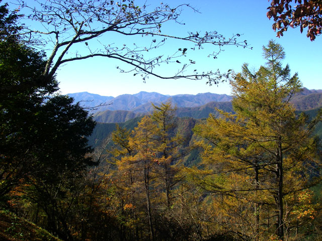 道標の「赤杭山・古里駅」方向に従って林の中の細い道をたどると、すぐに開けた空間にぽんと飛び出る。曲ヶ谷南峰(1,320m)と呼ばれているところだ。真南へ急に下っているのは舟井戸に向かう道だが、西へ延びている赤久奈(あかぐな)尾根の道をたどる。前方遠くに市街地が望め、西武ドームの屋根が白く光っている。