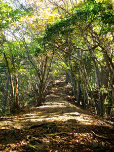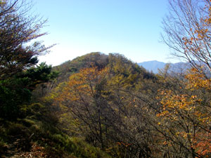 いくつか小谷を横切って30分ほど行くと足毛岩の肩に着く。ここからほんの少しきつい登りがあるが、気持ちのいい樹々の間を行くと、間もなく小さなピークに着く。行く手に目をやると目指す川苔山の山頂が目に飛び込んでくる。