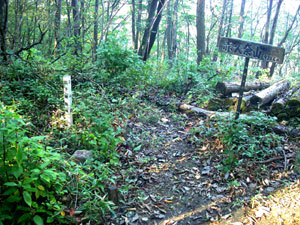 狼住所(おおかみすんど)と呼ばれる平坦なところで「大丹波・獅子口」への道を左に分ける。ほどなく真名井沢の頭(1,168m)が道の左側に現れるのだが、意識していないと見逃してしまうほど小さなピークだ。手前にある「鳩の巣駅・川苔山、赤杭山・古里駅」と書かれた古い道標が目印になる。