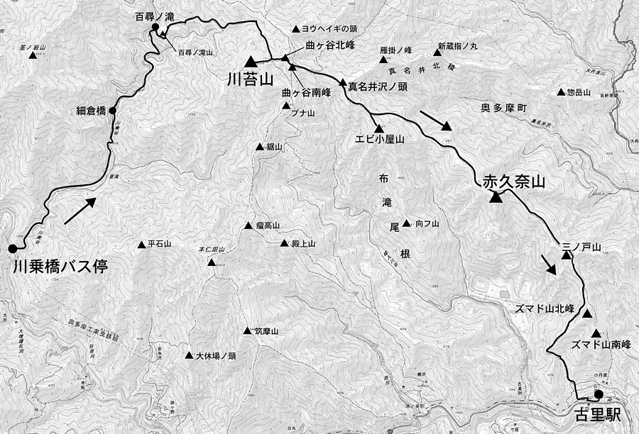 十字路にある道標で「日向沢ノ峰・蕎麦粒山」方向を確認して直進する。すぐにある「古里駅へ」という小さな道標を過ぎ、間もなく曲ヶ谷北峰に着く。振り返ると、先ほど後にした川苔山のピークがすぐそこにある。目を右にやれば、蕎麦粒山から天目山への稜線がきれいに見えている。
