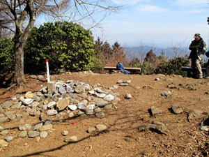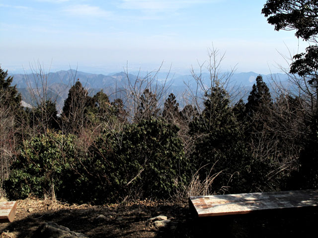 広葉樹に包まれるようになると、傾斜が緩んで分岐の道標に達する。分岐を右に下るとチクマ山を経て花折戸尾根、途中で分岐するゴンザス尾根への道だが、あまり勧められない。このあたりはすでに頂稜だ。ほんのわずかで山頂に出る。山頂は、周辺の樹木が伐採され、以前とは打って変わって明るくなった。かつては売店だった小屋跡も撤去され、広々とした雰囲気だ。東側が切り開かれて眺望があり、御岳山や高水三山などが望める。ベンチに腰掛けてゆっくりと大休止したくなる。