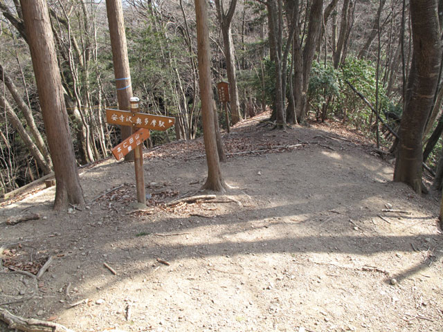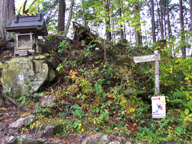 道標から右の植林に入ってジグザグに下る。日の当たるところにはアセビも交じり、やがて左下から大ダワ方面からの道を合わせる。しばらく下ると突然明るくなり、林道西川線のカーブに飛び出す。舟井戸から川苔山方面への分岐だ。林道は崩落もあり下山には適さない。カーブのすぐ脇に下山時の休憩ポイント、大根ノ山ノ神(おおねのやまのかみ)が祀られている。小さな祠が岩の上に立ち、石仏がある。無事の下山を拝んだあと鳩ノ巣駅のある棚沢集落に向かって植林の中の下山を続ける。雨でえぐれている箇所も多く、歩きにくい道である。足の疲労もある。最後の30分を気を抜かずに下山する。途中の分岐に、右に熊野神社経由鳩ノ巣駅とあるが、直進して正方院経由の道が歩きやすい。