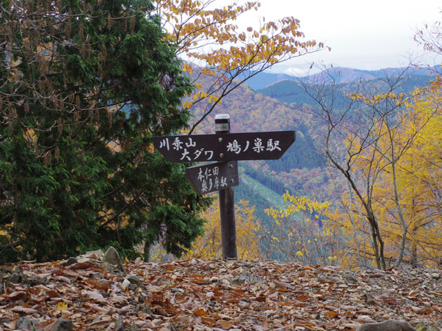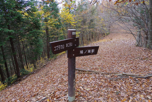 道標から東に緩く下り林間を行くと、左手に長沢背稜の山並みが望める。しばらくすると東側に突き出て開けた地点に達する。瘤高山である。山名表示はなく、道標の片隅にかすかに記されている。東側の眺望はすこぶるよい。川苔山や狭山丘陵、都心部までが望める。ゆっくり休みたいが、狭いうえに東側が切れ落ちており、数人が限度である。立ち休みとしよう。ここは大ダワを経て川苔山方面への分岐で、北側の木立から急坂を下って行く。