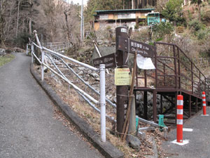 奥多摩町役場の前を通り、石灰石工場を右に見て、日原川にかかる北氷川橋を渡る。氷川国際マス釣り場が右手にある。ワサビ田が見え隠れして植林が切れると安寺沢集落に入る。林道が大きく左に曲がる最初の家の角に道標がある。モノレールに沿った手すりの左側を入って、住宅の裏を右に曲がると自然に登山道となる。