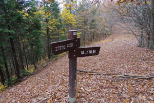 山頂から北に向かい、ほぼ水平の気持ちよい広葉樹林の中を進む。数分で道標があり、分岐らしいところがある。平石山から日原川の平石橋に通じる平石尾根があるが、立ち入り禁止のロープが張られている。