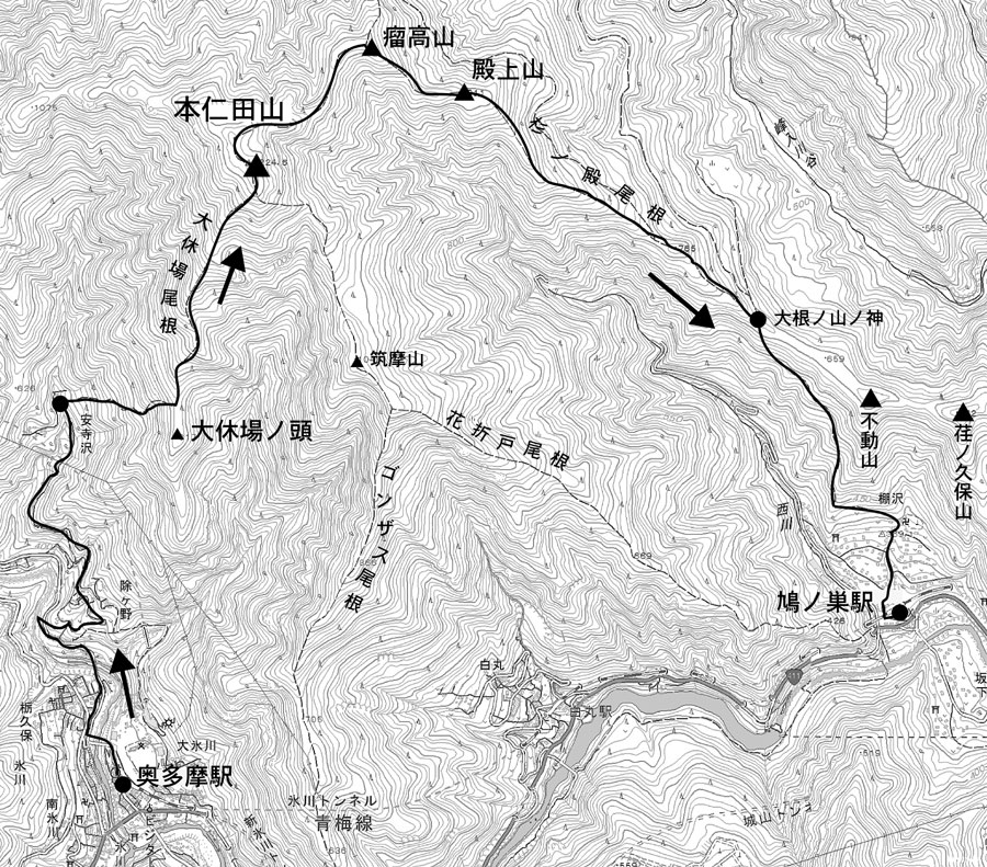 本仁田山は、奥多摩駅の北側にどっしりとした円錐形の立派な山容を見せている。けっして低山ではない。別称は本荷駄山、愛称は奥多摩富士。山名の由来はイノシシが泥浴びするヌタ場からきたというのが有力だ。アプローチは、南側からの大休場(おおやすんば)尾根と東側から瘤高山(こぶたかやま/1,115m)を経た杉ノ殿(すぎのと)尾根がある。西側に平石山を経る平石尾根があるが、地形図にはルートの表示がない。南には花折戸(はなおりと)尾根、ゴンザス尾根があるが、急な部分もあるので注意が必要だ。