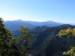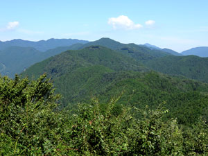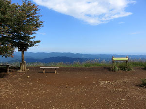 さらに尾根を行くと、道標に手書きで「常盤の前山」とあるところで左に曲がり、急な下りを行くとトラロープのある小さな岩場を抜け、その先右側に切開きの展望台に着く。大岳山、御岳山の展望と奥には富士山の頭も見える。ここからも尾根を忠実に、小さいながらピークを幾つか越え、急な登りを終えた道標の左奥に、なだらかな輿越山(こしごえやま/725m)がひっそりとある。