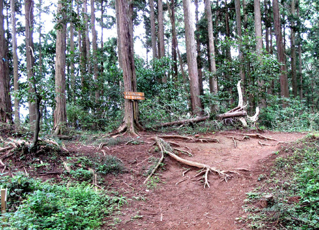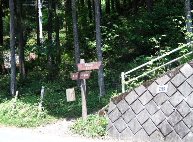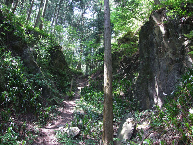 雷電山から道標に従って歩き、急な木製階段道を下って緩やかな尾根道を行く。右側に空堀のように見える切通しがある。石灰石を運ぶために人工的に掘削したところだ。付近に大小の石灰石がいくつも転がっている。小さな尾根を乗り越し急下降すると二俣尾駅方面を示す古い道標が立っている。一部に薮の深いところがあるが、踏跡もしっかりしているので緊急時のエスケープ道に使える。駅まで約30分。