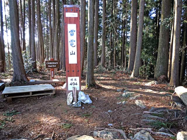 山頂は北方の展望が開け、石灰石や砂利の採石場が見える。昭和30年代まで大々的に採掘し、鉄製ロープウェイで雷電山を越えて二俣尾駅まで搬送したそうだ。山の由来は、雨乞いのために祀った雷電社という小さな神社があったからというが、痕跡はない。山頂から南に延びる尾根は荒れて通行禁止になっている。