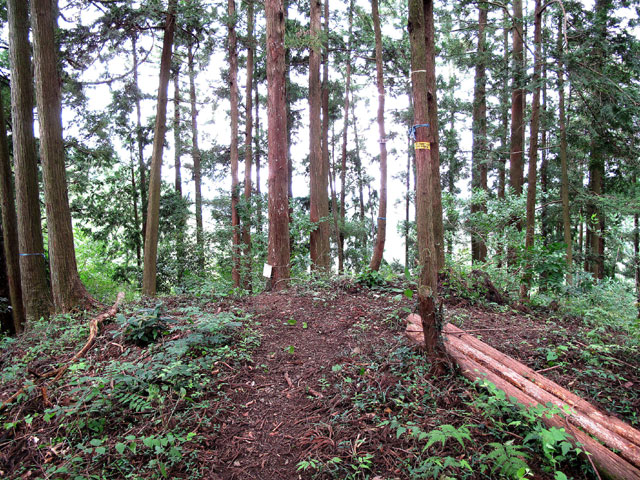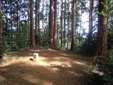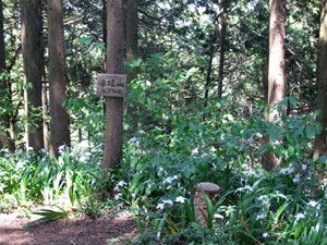左の辛垣山方面に行く道は、最初は緩やかだが空堀らしい窪みを越えると急な登りとなり、スギ植林に囲まれた狭い山頂に着く。展望も遺跡もなく、小さく辛垣山と書いた標識があるのみだ。春はシャガの花があたり一面に咲く。左に急下降すると城跡に着く。解説板には「当時の面影は残っていないが、空堀や土塁がわずか残っている。永禄6(1563)年に八王子・滝山城の北条氏照に攻められ落城。城主の三田綱秀は岩槻城に落ち延び自害した」とある。