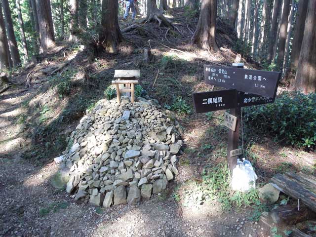 城跡から急な道を下ると、先ほど分かれた巻道と合流してすぐ名郷(なごう)峠に着く。峠には小さな祠と御清水と書かれた水が入ったペットボトルが数本置かれている。峠は二俣尾の集落と成木川沿いの正沢集落を結ぶ最短コースだが、正沢集落方面の道は草木に覆われ定かではない。