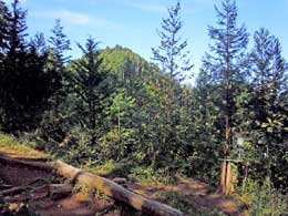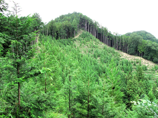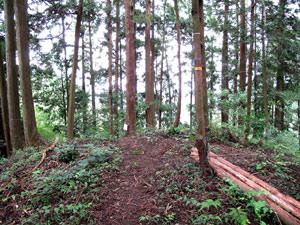 ロープの設置された短い急坂を登り終えたピークにはベンチがあり、北側の展望が開ける。さらに急下降して送電鉄塔の横を通り、緩やかな尾根道を行く。春は、ツツジやコアジサイなどが咲いている。この付近はニホンカモシカが定住している森で、運がよければお目にかかれるかもしれない。