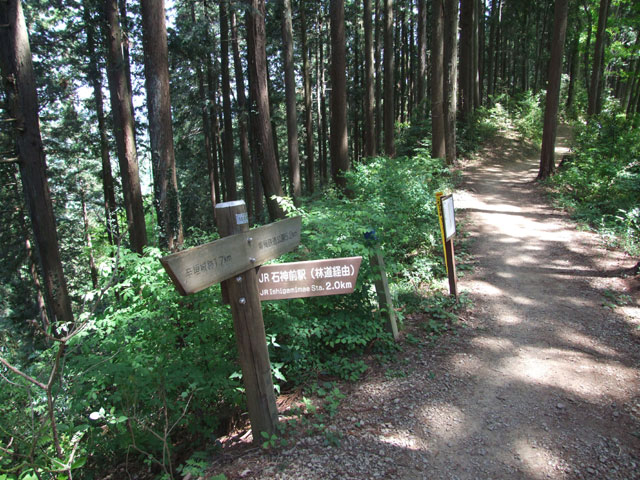 この先で栗平集落へつながる林道への分岐に出る。もうひとつ先の分岐で鉄道公園まで延びる青梅丘陵ハイキングコースと分かれ、立派な道標のあるところを右、石神前駅方面に下る道に入る。1カ所だけロープの掛かった岩交じりの下りがあるので慎重に下りたい。しばらく歩くと幅の広い平坦な道となり、のんびりと駅まで歩くだけだ。
