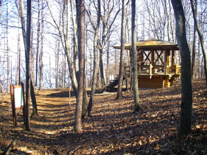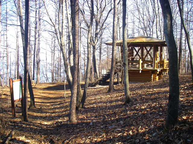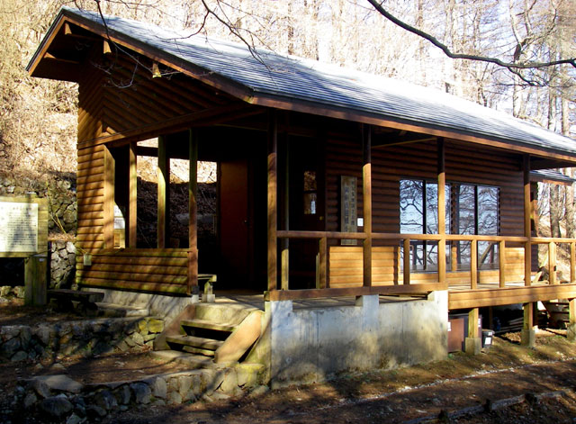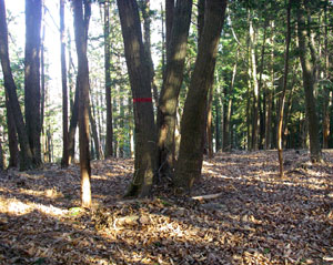 体験の森の中は地形図に描かれていない作業道が入り組んでいて少し分かりづらいのだが、トチノキ広場から先は「登山道 御前山」という道標に従って歩けばいい。40分ほどでカラマツの広場に着く。カラマツの林の中に東屋がある。気持ちのいい場所だ。春にはカタクリが咲き、冬には石尾根や川苔山、蕎麦粒山方面が、葉を落とした木々の間から眺められる。