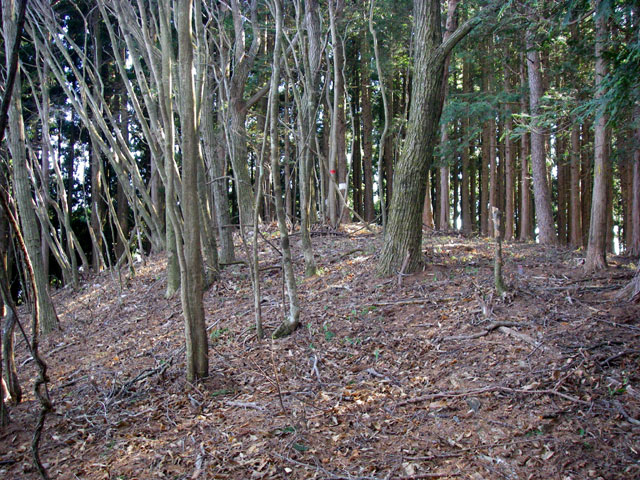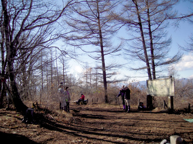 その先に「湯久保・小沢」の道標があり、登山道は左に曲がって下りて行くのだが、ここを直進して小さなコブを越えるとモーテ山(1,120m)だ。ここにも樹木に山名を書いた赤テープが巻いてある。林の中で展望はまったく利かないが、珍しい名前の山なのでピークを踏んでおくのもいいだろう。