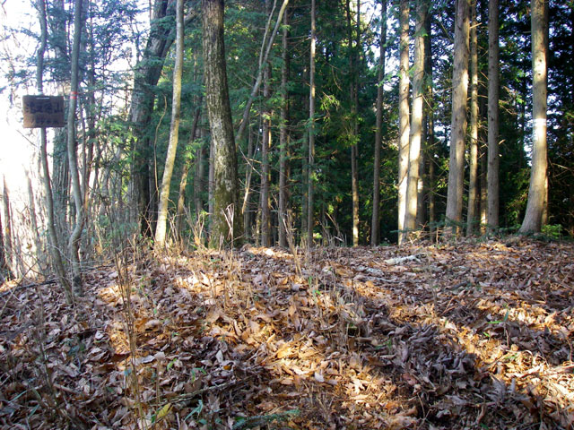 道標まで戻り、左手に間近になってきた大岳山が木の間越しに見え隠れする登山道を下りて行くと、いったん登り返しになり、その登りが終わって道が左に曲がるところに「湯久保・小沢」の道標がある。そこを尾根通しに直進すると、すぐに湯久保山のピークに着く。「湯久保山1044m」と表札のように書かれた板が木にかけてあるだけの静かなピークだ。ここも樹林のために展望はほとんどきかないが、登ってきた御前山が樹々の間から望める。