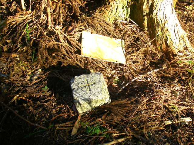 下草に隠れた三角点を探す
