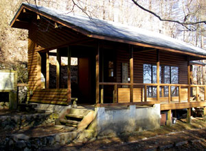 林道をそのまま進むと、体験の森の拠点となる栃寄森の家がある。宿泊もでき、森を育てる大切さを知ることができるさまざまな体験活動を行っている。さらに林道を行き、一般車通行止を過ぎてしばらくすると、右手に「ヒノキの広場を経て御前山」の道標がある。こちらは、ヒノキの広場、スギの木広場、落葉樹の広場などを経て、御前山と西隣の惣岳山との鞍部に出る登山道だ。