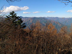 さらに30分ほどで御前山避難小屋に着く。ログハウス風のとてもよく整備されている綺麗な避難小屋で、トイレもある。その先に山頂への分岐がある。階段状を10分ほど頑張ると頂上だ。御前山一帯はカタクリの花で有名で、シーズンの春先には山頂も混み合う。周囲にカラマツが伸びていて、展望はあまりよくない。北には木の間越しに石尾根を、南西には笹尾根の向こうに富士山を眺める。