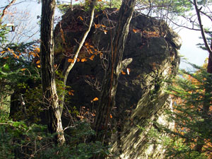 再び登山道に戻り、落葉広葉樹の間の気持ちのよい道をなおも行くと、標高1,010mあたりで道が右へ曲がりながら下り始める。左の稜線が登山道から離れないうちに、適当なところで稜線に乗り、まっすぐ進むと、あまり手入れされていない鬱蒼とした植林の中に仏岩ノ頭のピークがある。スギの木の根元、倒木の下に三角点がひっそりと置かれている。そのまま直進しても登山道に出るが、このあたりはその名のとおり岩、それも巨岩が多いので危険な箇所もある。来た道を引き返して登山道に戻ろう。
