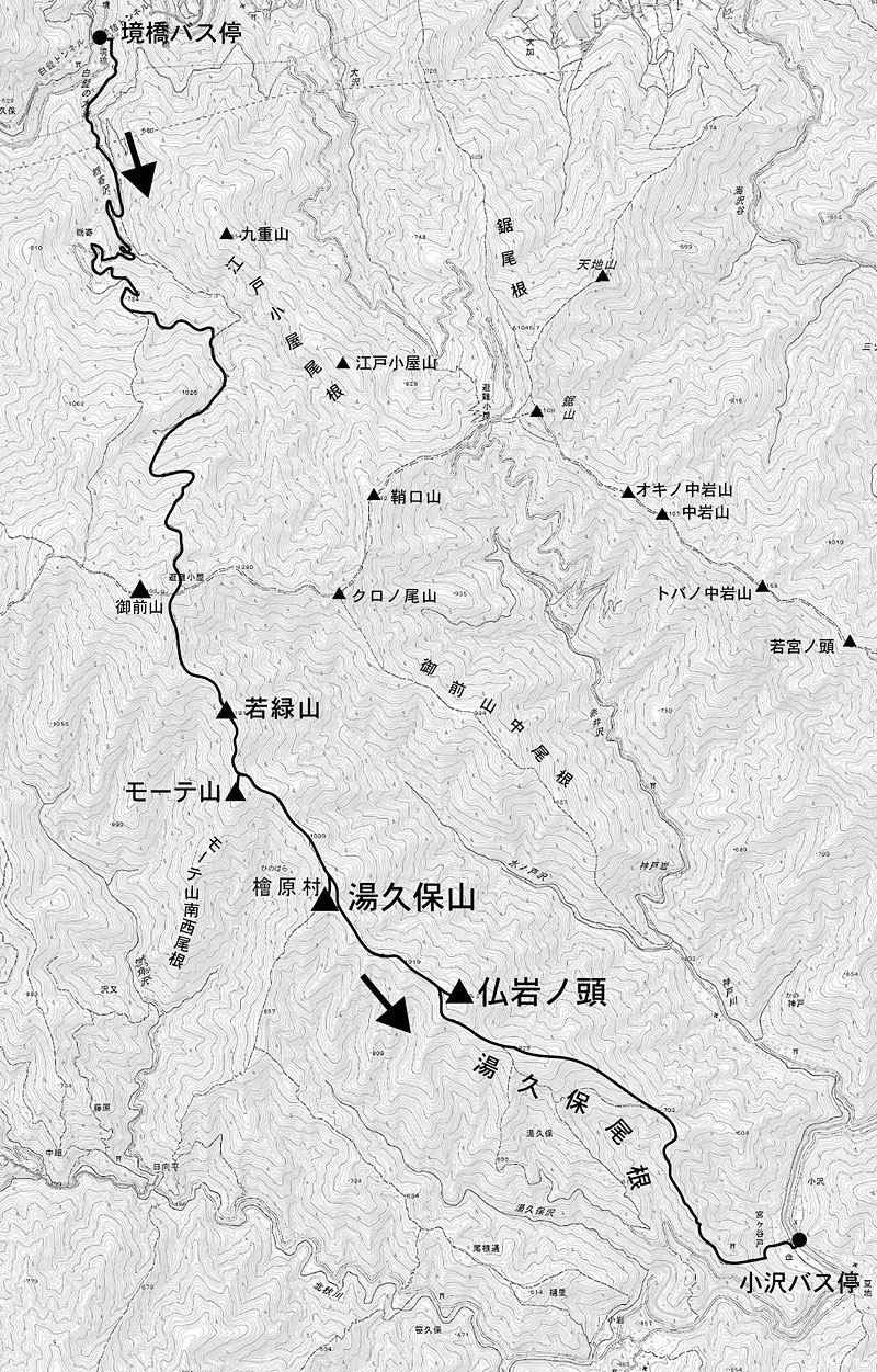 下山は、西へ惣岳山、サス沢山、小河内ダムのコース、また東へクロノ尾山、大ダワ、鋸山、奥多摩駅のコースなどがよく使われているが、南へ湯久保尾根を下りる。山頂から、来た道を引き返し、先ほどの避難小屋からの道との分岐を右へ。ほんの数mで大ダワ方向と湯久保尾根を分ける分岐があるので、道標に従い湯久保尾根への道に入る。1/25000地形図では、避難小屋への分岐と湯久保尾根への分岐が50mほど離れているが、実際はほぼ十字路になっている。