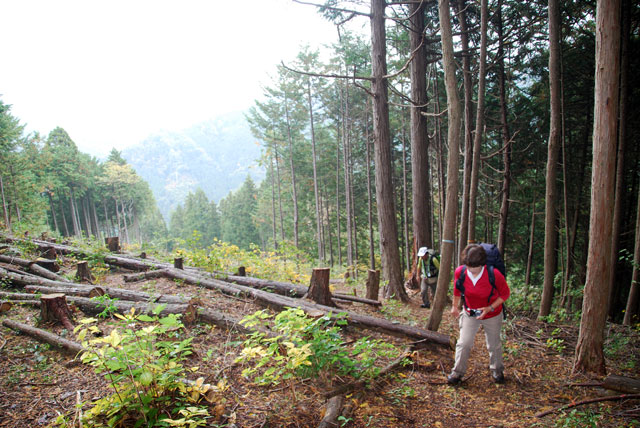 林の中に入って行くが、踏み跡がついており、道に迷うこともない。踏み跡が弱いので落ち葉の季節は覆われて、見えにくいので注意が必要だ。緩い登りが尾根に達すると伐採地に飛び出す。北面が一望でき正面にどっしり構える本仁田山の意外な姿に目を奪われる。