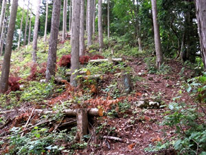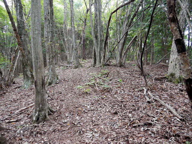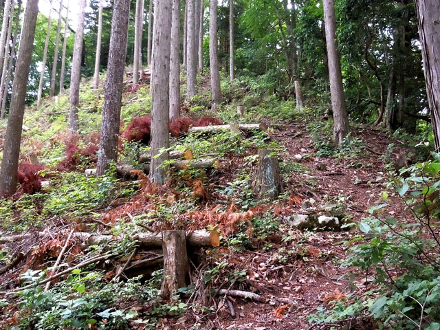 犬の飼育場を過ぎ、しばらく林道を行くと分岐となる。右側に回る方向は綺麗だが、左に回る方向は倒木でふさがれており、その上は丈の高い草で覆われている。この草生したほうの林道が登山方向である。しばらく草をかき分けながら斜面を斜め方向に向かうと稜線に出て、見晴らしがよくなる。右に回りながら100mほど進むと、林道の終点となる。