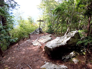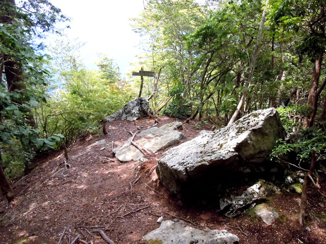 ようやく着いた天地山の頂上は大きな石が数個ある4、5平方mくらいの狭い場所で、北方向に少し見晴らしがあるが、あとは広葉樹で覆われている。馬酔木の木がたくさんある。朽ちた木製の板に山名を示す表示が読める。