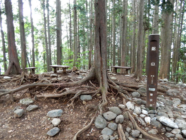 木の間から左手に鋸山の山頂が見える。底まで下りると再び急登が続く、ぐんぐん登るしかない。やがて鋸尾根との合流点に到達する。ここに道標があるが、「天地山方面は行き止まり」の看板が地面に落ちている。鋸山まで300m。余裕があれば往復してこよう。鋸山の頂上に広場がある。周囲を木立で囲まれ、見晴らしは期待できないが、御前山、大岳山へ行くルートの交差点なので寄ってみる価値はある。