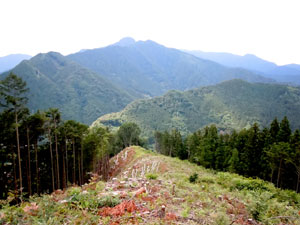 伐採地から200mほどの急斜面となり、674mのピークに立つ。ここからの眺めがよい。いったん20mほど下るが、約1.5kmの、ひたすら急斜面の登りが続く。