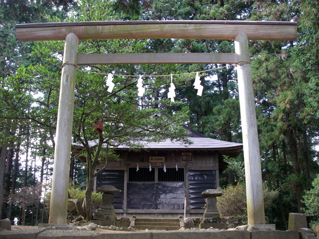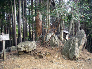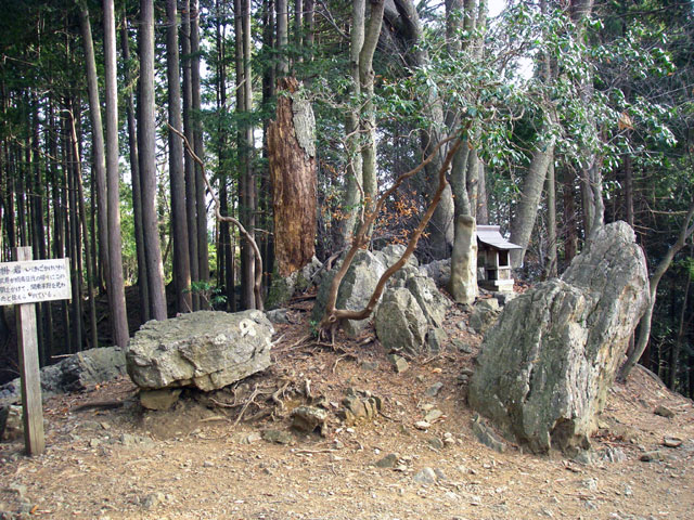 ほとんど平坦な道を進むと、右「金比羅山」左「武蔵五日市」と書かれた道標がある。右に進むと大岩の磐座(いわくら)を過ぎて琴平神社の裏手に出る。神社の前に「金比羅山468m」と書かれた札が掛かっているが、地形図上の金比羅山は先ほどのところだ。道標は琴平神社のあるところを金比羅山とみなしているようだ。
