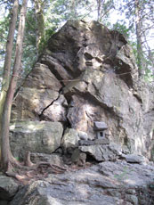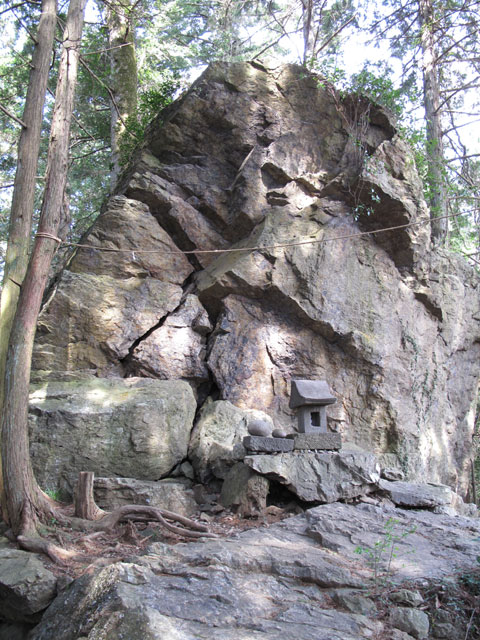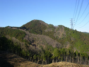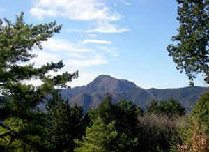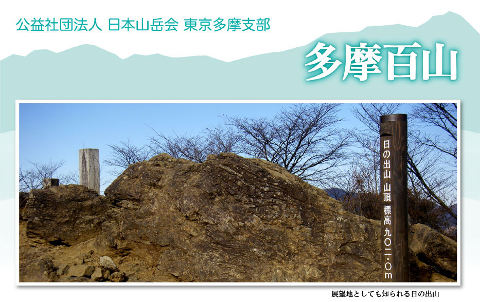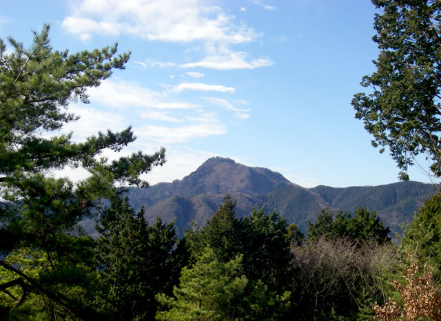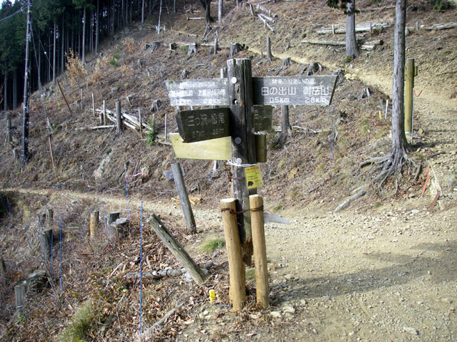 日本武尊ゆかりの顎掛岩などを過ぎ、しばらくするとT字路状の分岐に出る。道標にある「日の出山 新道」とか「都道 この先から登山口まで舗装されています」などというまぎらわしい誘いは無視して、右にゆるやかに登っている方向に進む。ほどなく左側の谷全体が若い植林でいっぱいの見晴らしのいいところに出ると、再び親切な道標があり、ここは素直に「日の出山」と指示されている方へ階段を上る。階段右手にクロモ岩と呼ばれる小ピークがあり、休憩したくなるが日の出山へはもう少しだ。